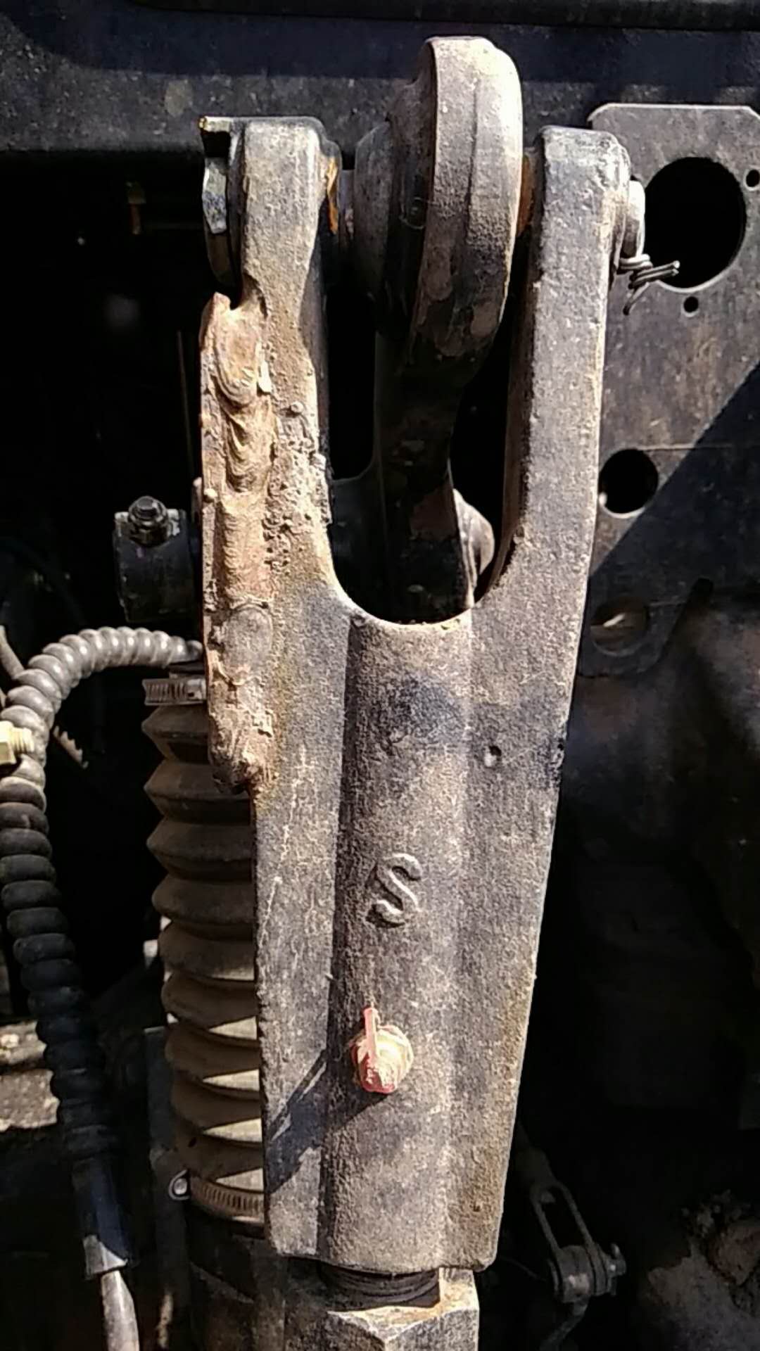 这是东方红LX1504拖拉机,提升杆叉断裂。这么粗壮的金属材料怎么会轻易的裂断呢?是什么原因请大家共同探讨。